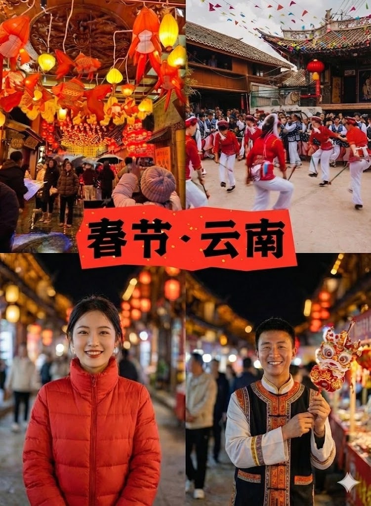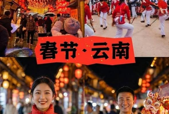 上午:前往【官渡古镇】,这座有着千年历史的滇池名镇在春节期间年味十足。漫步古镇街巷,红灯笼高悬、春联鲜红,品尝云南特色小吃如官渡粑粑、豌豆粉、米线等地道美食,在古色古香的庙宇间感受昆明人的传统年俗。