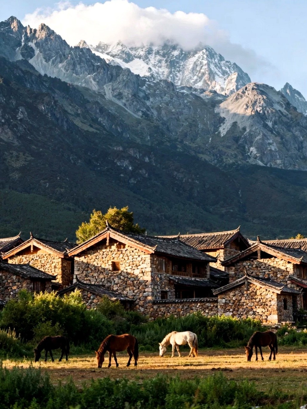 上午:乘车前往丽江,抵达玉龙雪山脚下的【玉湖村】。这座用石头砌成的古朴村落是纳西族的发源地之一,至今仍保留着最原始的纳西风貌。