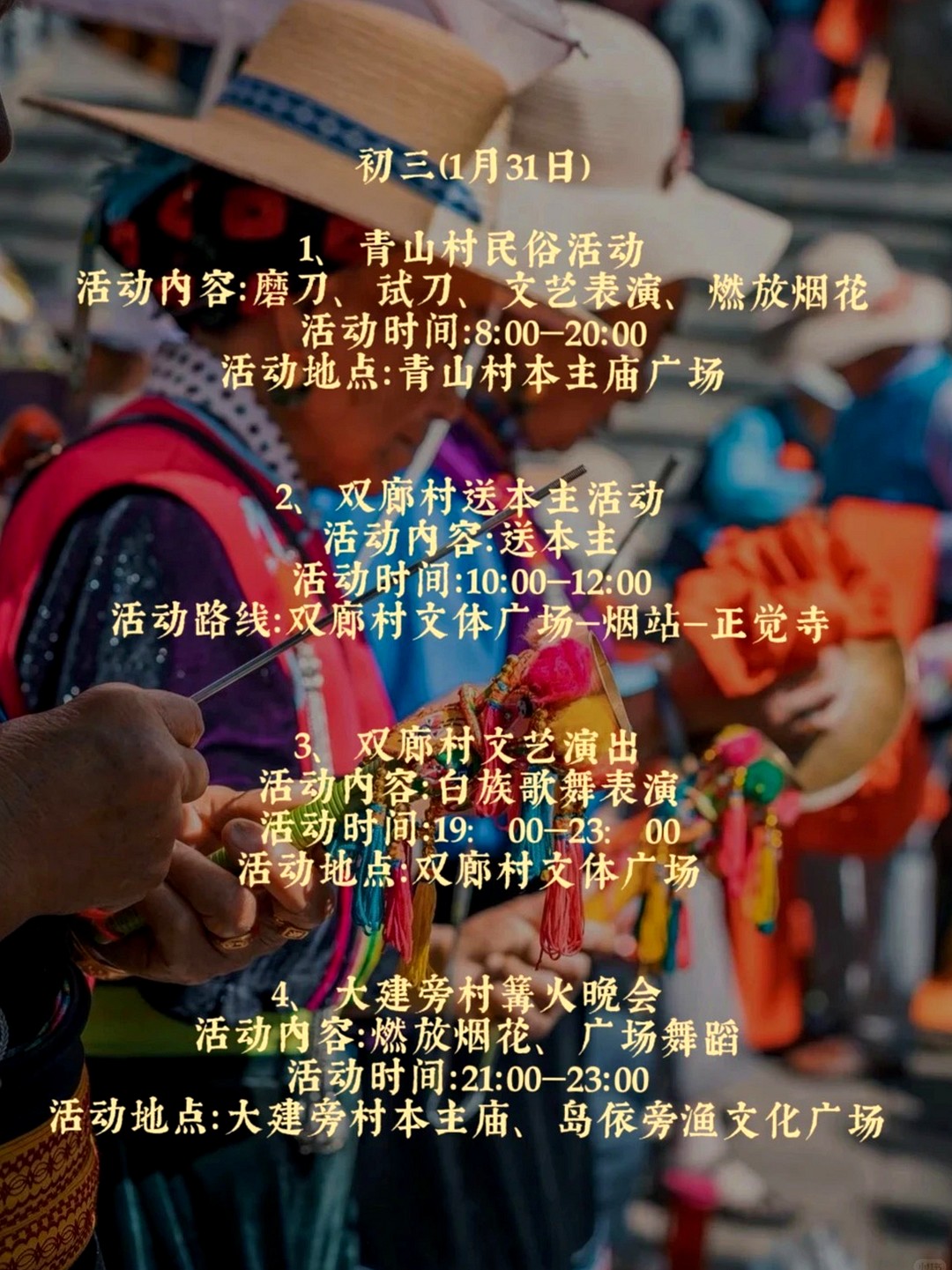 特别说明:以上节庆活动为2025年春节双廊参考案例,今年(2026年)的具体活动时间表尚未发布,届时我们会根据实际活动安排灵活调整行程,确保不错过精彩民俗体验。