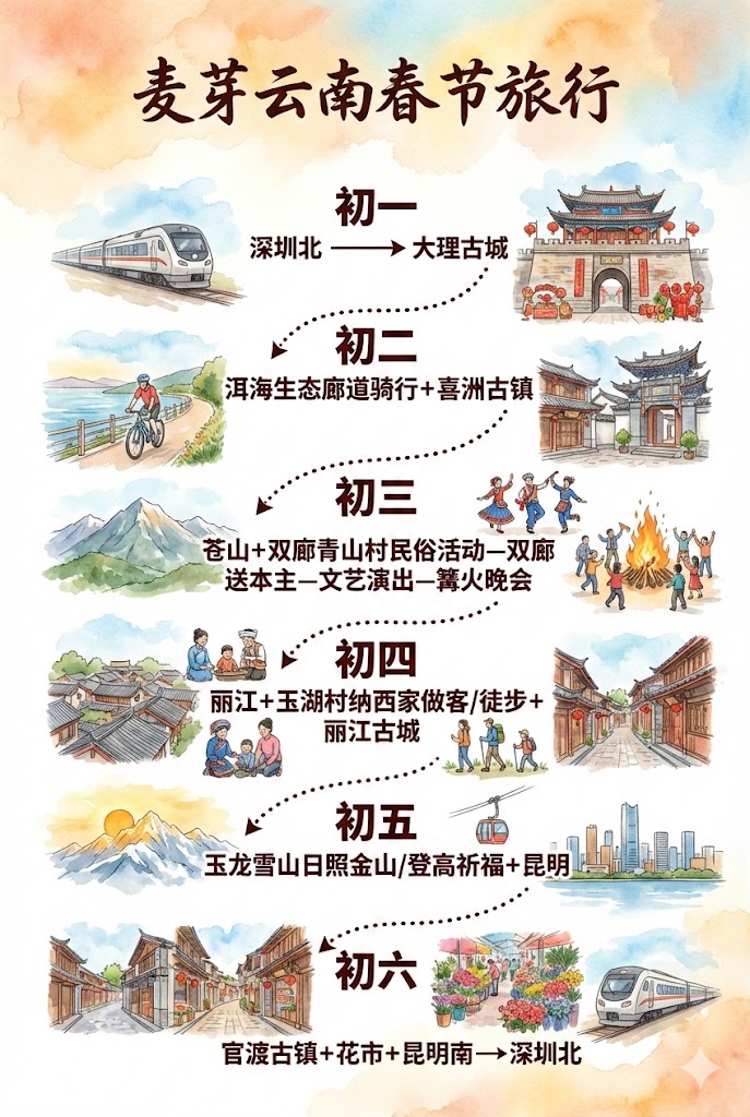 ✔ 最佳路线:深圳高铁直达大理,丽江行程结束后动车回到昆明,全程不走回头路,是所有行程方案中当地大巴车程最短