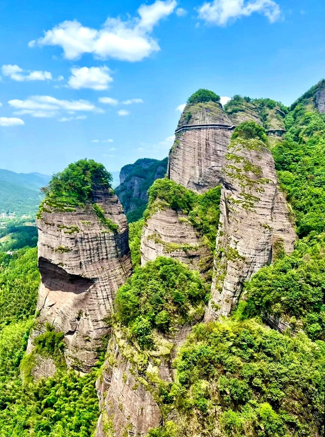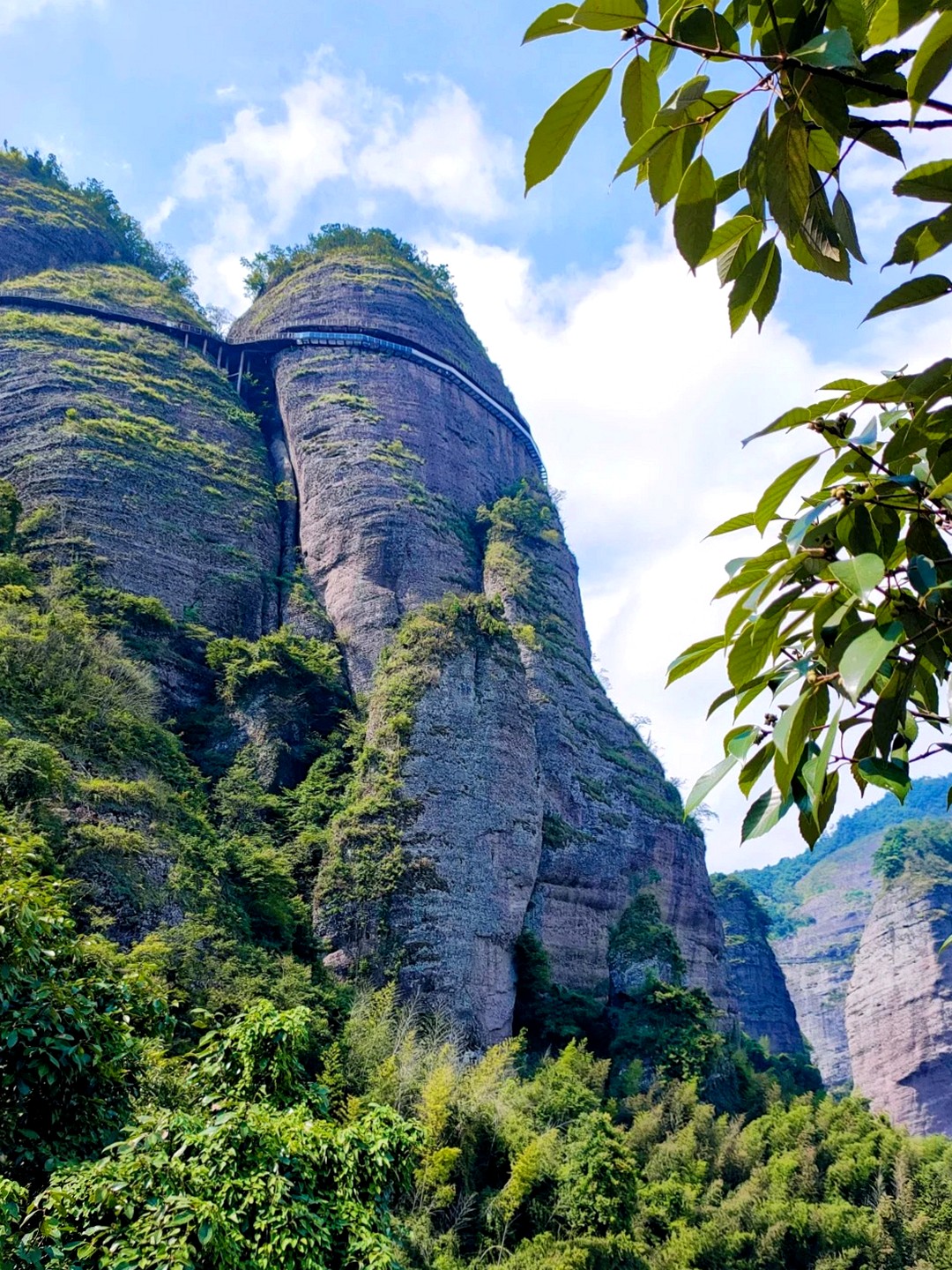 游览【南武当】,欣赏九十九座丹霞奇峰直指苍穹的壮丽景观,穿行于400米高空的玻璃栈道,体验"踏空"的刺激。"五女拜寿"、"吞天洞"等奇景让人叹为观止,登高远眺,十里丹霞如画卷般徐徐展开。