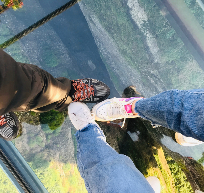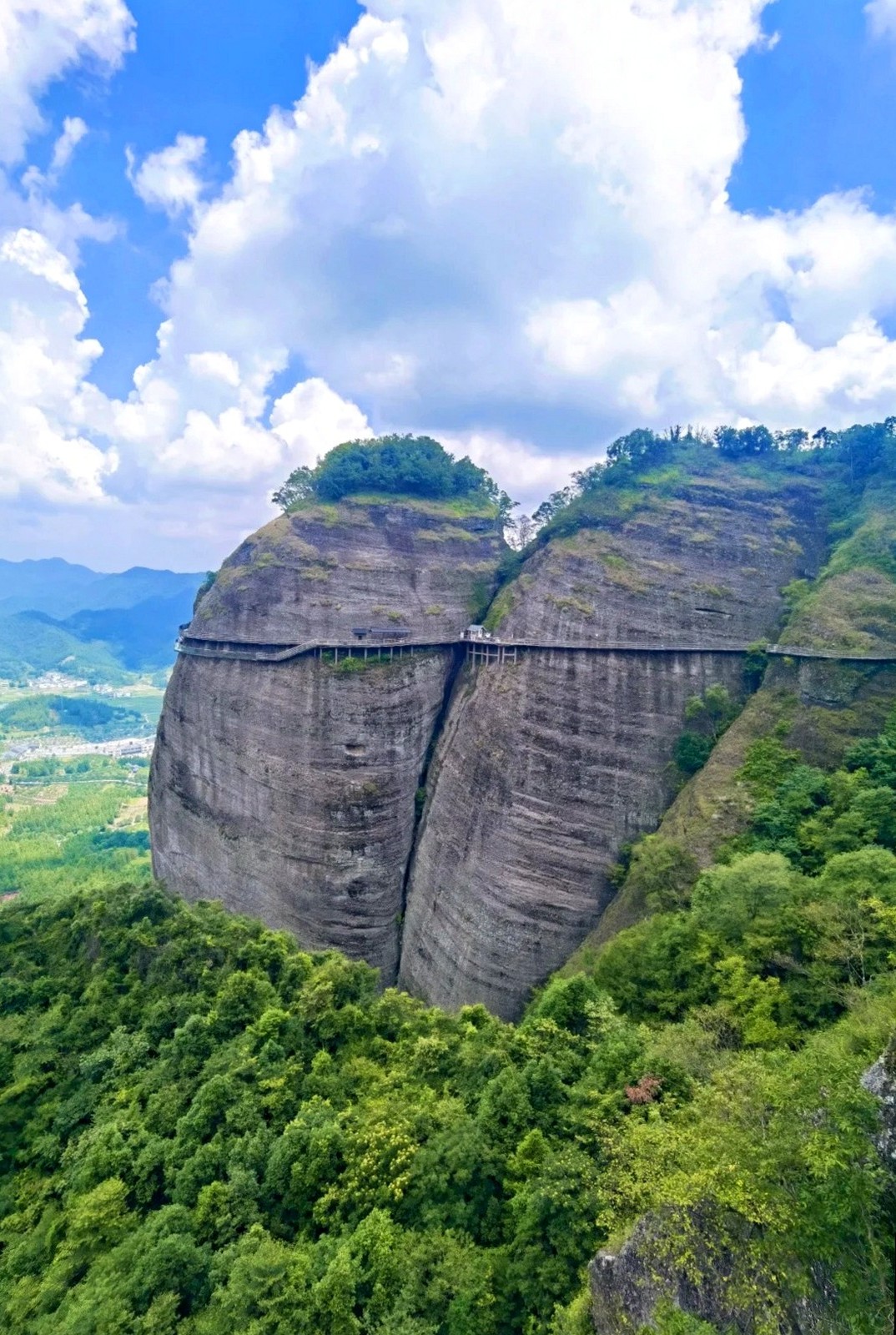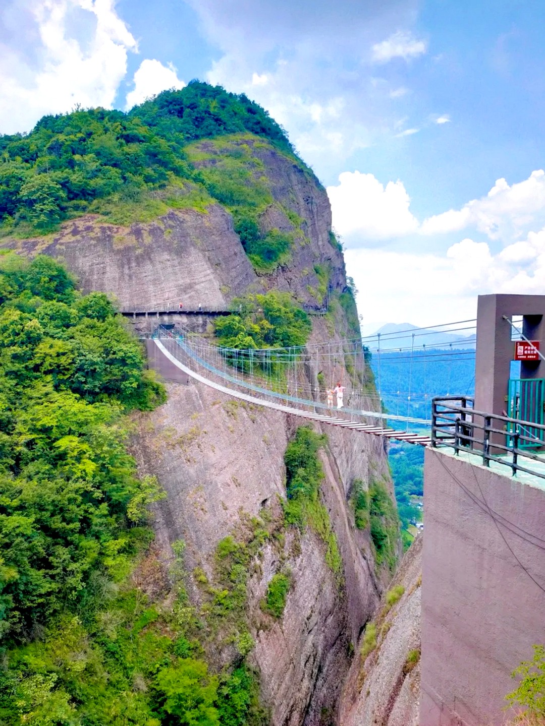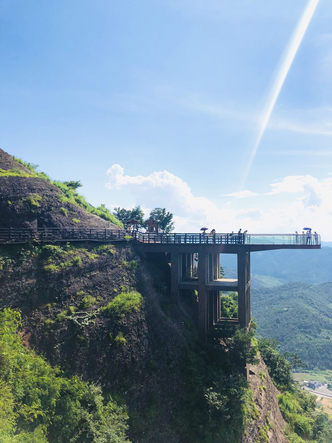 景区内全长219米的玻璃栈道,是江西省目前最长的一座全景玻璃天桥,悬挂于400余米高空的王母峰绝壁之上,紧贴峭壁而建,凌空蜿蜒穿行,桥面采用透明钢化玻璃铺设,透过玻璃向下就能看到垂直的山体。