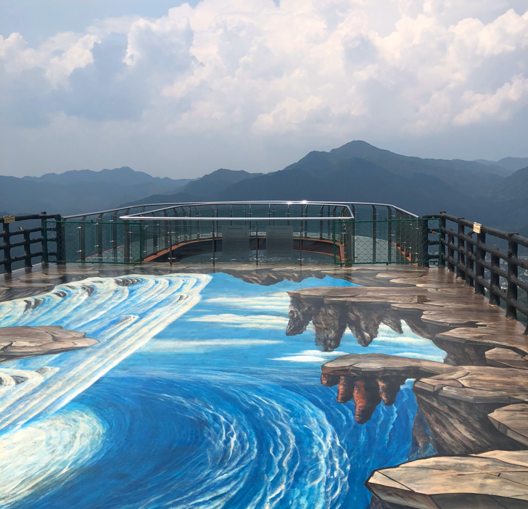 可眺望武当全景的U型玻璃眺台,平台总面积200余平方米,悬眺跨度22米,是赣粤两省最大的玻璃眺台,置身玻璃眺台之上仿佛与云雾齐肩,伸手便可摘星